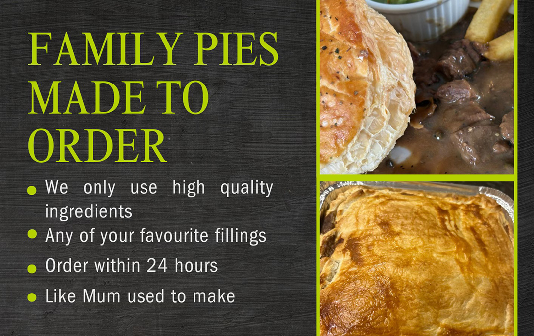 Our plate pies are made to order, ensuring every one is freshly baked and packed with flavour. Each pie features a golden, buttery pastry filled with hearty, home-style ingredients — from classic steak and ale to tender chicken and leek or rich vegetable fillings. Perfect for events, lunches, or comforting meals, our pies are crafted with care using quality, locally sourced ingredients. Made just for you, they offer a delicious, authentic taste in every bite.